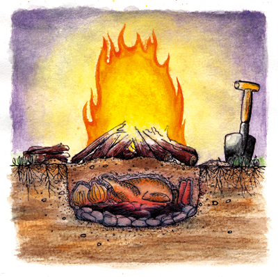 次に30cmほどの穴を掘り、火をおこす。おき火になった頃に新聞紙で包んだ鶏を穴に入れ、土をかぶせ、その上でさらに焚き火を続ける。2時間ほどして穴を掘り起こすと、中から柔らかく蒸し上がった鶏の丸焼きが登場するという仕掛けである。最後のアルミホイルを開けて鶏が見えた瞬間、拍手喝采が起こること請け合いの料理だ。ついでに、ジャガイモやニンジンなども丸ごと突っ込んでおくと、付け合わせも一緒にできてくる。翌朝は鶏ガラのスープをとってもいいし、残った実をほぐしてチキンライスも悪くない。