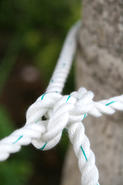 おかの上、つまり一般のアウトドアシーンでもロープワークは大いに活躍する。キャンプに行って、「洗濯物やシュラフを干したいからロープを張って」と頼まれた時、手際よく木と木の間にロープを"ピンと"(←ここが大事)張れると、何だか尊敬される(ような気がする)。あるいは、ロープが切れた時、2本を繋いで応急処置ができたりすると、何だか頼もしい(と思う)。キャンプ道具を開いた時、コールマンのキッチンセットが入っているより、ぶっといロープが現われる方が男らしい(と言って欲しい)。