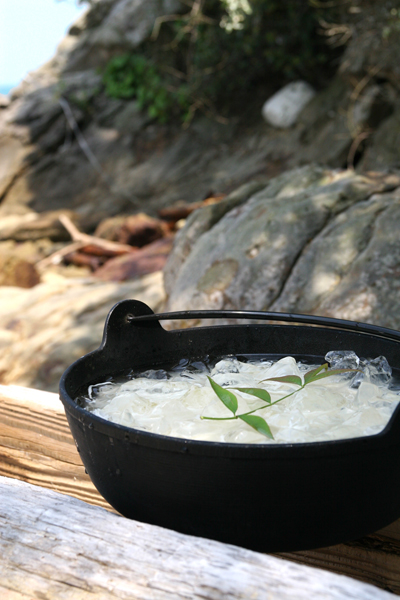 無人島へ上陸すると、早速昼食の準備。「無人島バーベキュー」といっても、メインは「そうめん」である。茹でたそうめんをタッパーに詰めて持ち込み、大きな器に盛って水と氷をぶち込んだらできあがり。簡単で、涼やかで、くたびれて食欲がない時でもツルツルと喉越しよく口に入る。汗ばむ季節、海に出た際の定番料理だ。焼いた肉や野菜をおかずに、みんなでツルツル。