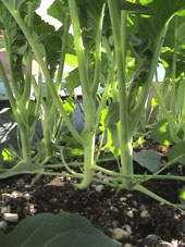 そこで、一人で撮影大会を行ってみることにした。以前、ブロッコリーを移植する時に、気がついたことなのだけれど、ブロッコリーの根元は、曲がっているのだ。ふつう、野菜というのは、土の表面 からスクッという感じで上に伸びてるものだと思うんだけど、ブロッコリーは曲がってる。表面 を2〜3センチほどという短さだけど、横に伸びた後、垂直に伸びている。