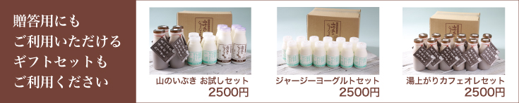全商品一覧 ジャージー牛乳 ジャージーヨーグルト プレーンヨーグルト カフェオレ プリン 生キャラメル その他 ギフトセット 山のいぶきお試しセット ジャージーヨーグルトセット 湯上がりカフェオレセット ![]() |